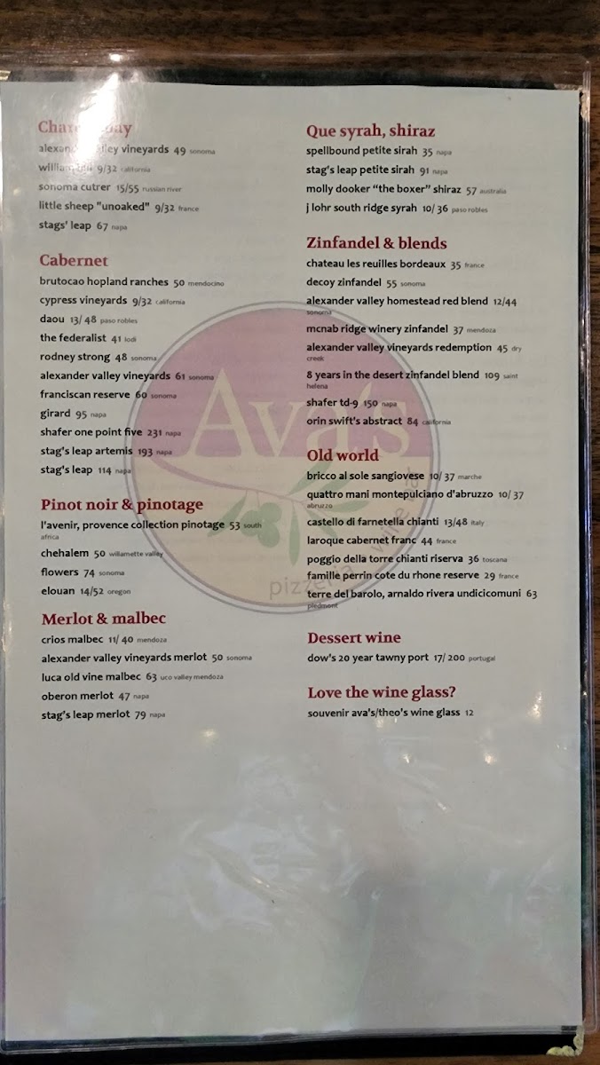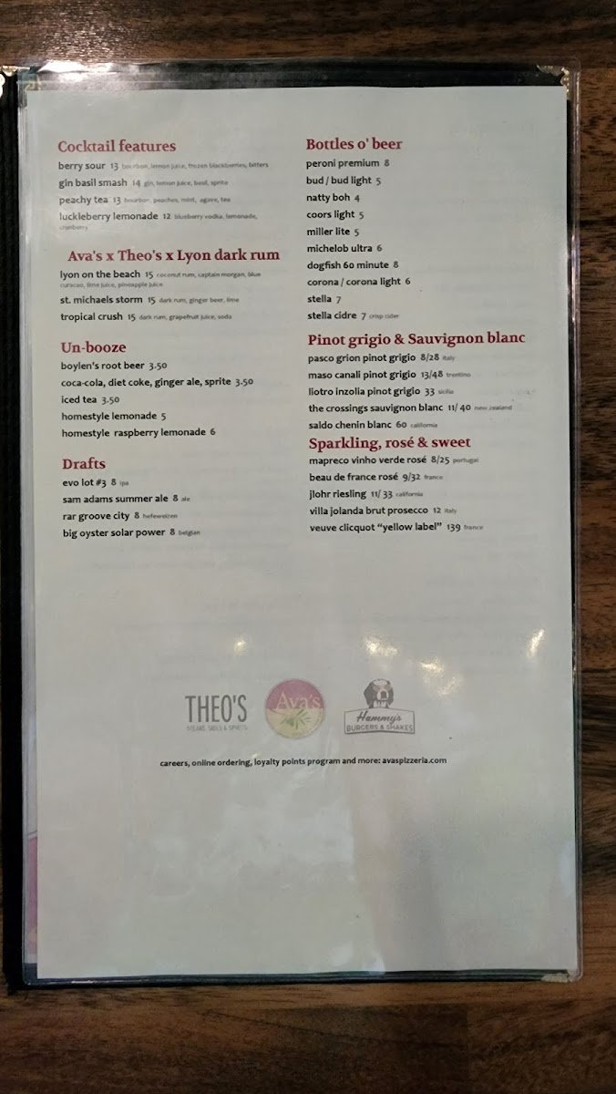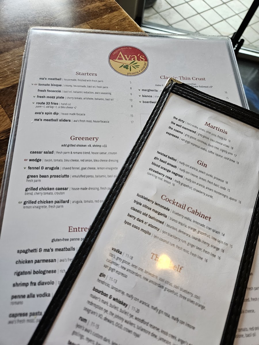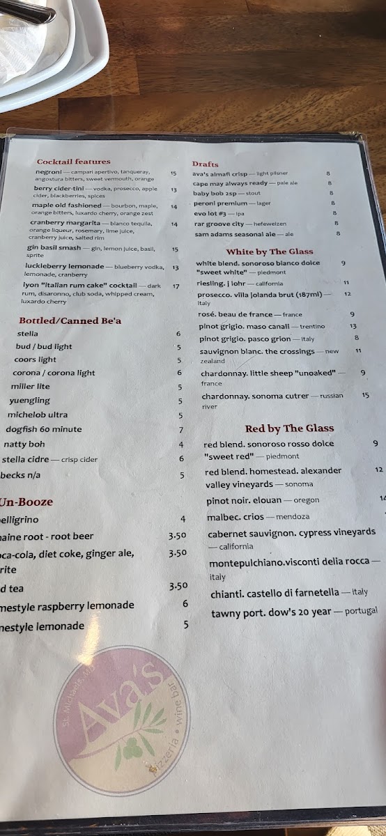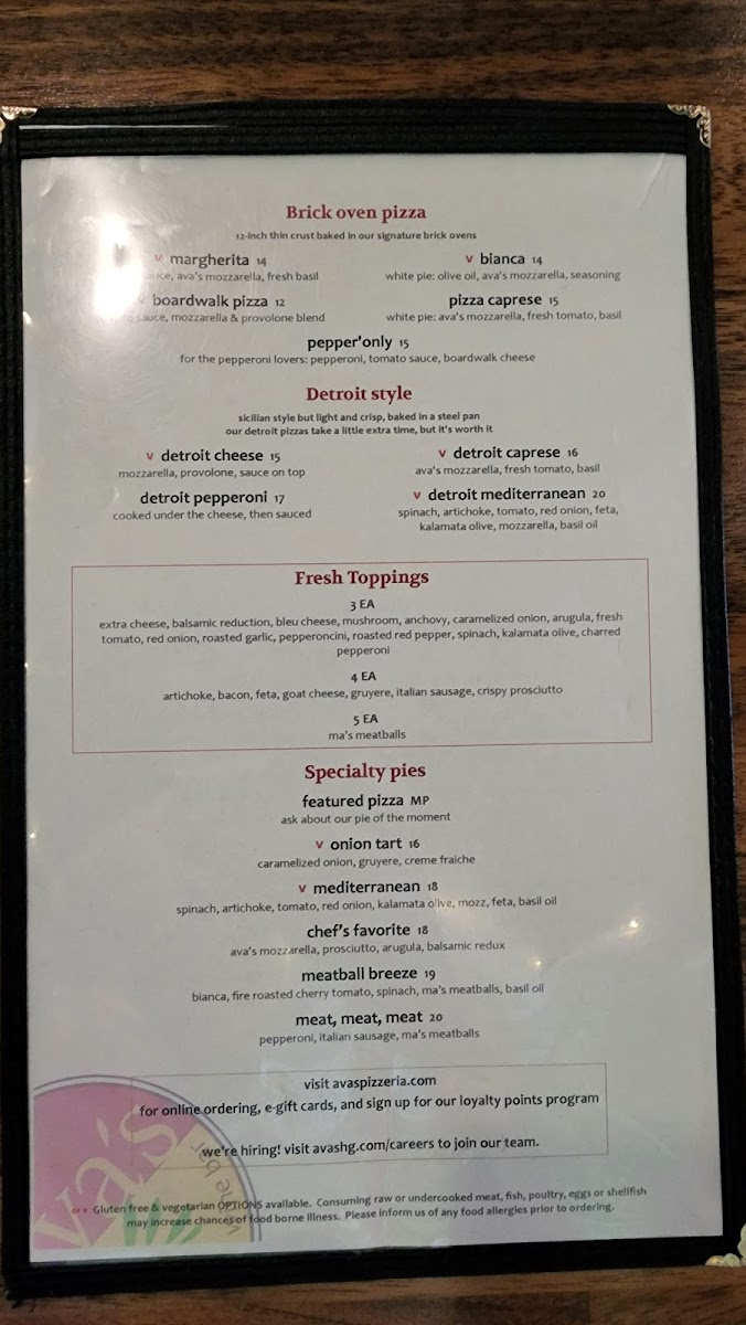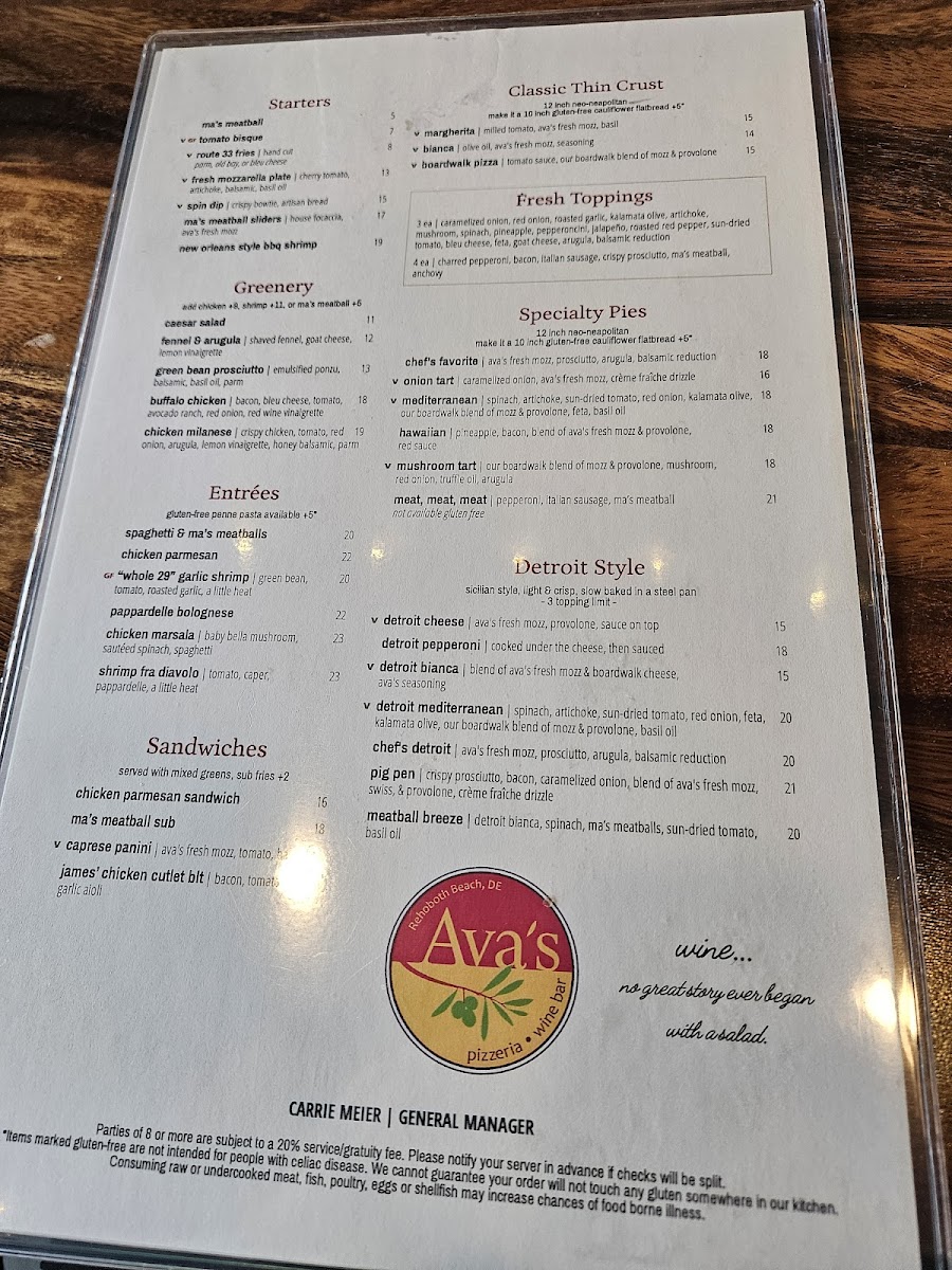 Ava's Pizzeria & Wine Bar - Rehoboth Beach Menu